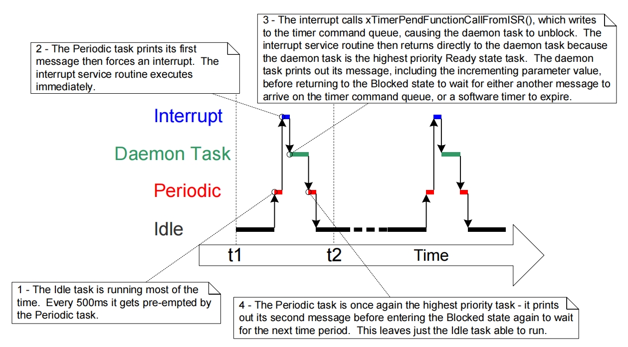 设置为 1,那么在 API 函数中会自动切换到更高优先级的任务——所以在 API 函数退出之前。 这已经在图 43 中看到,其中写入定时器命令队列导致在写入命令队列的函数退出之前切换到 RTOS 守护程序任务。如果从中断调用 API 函数